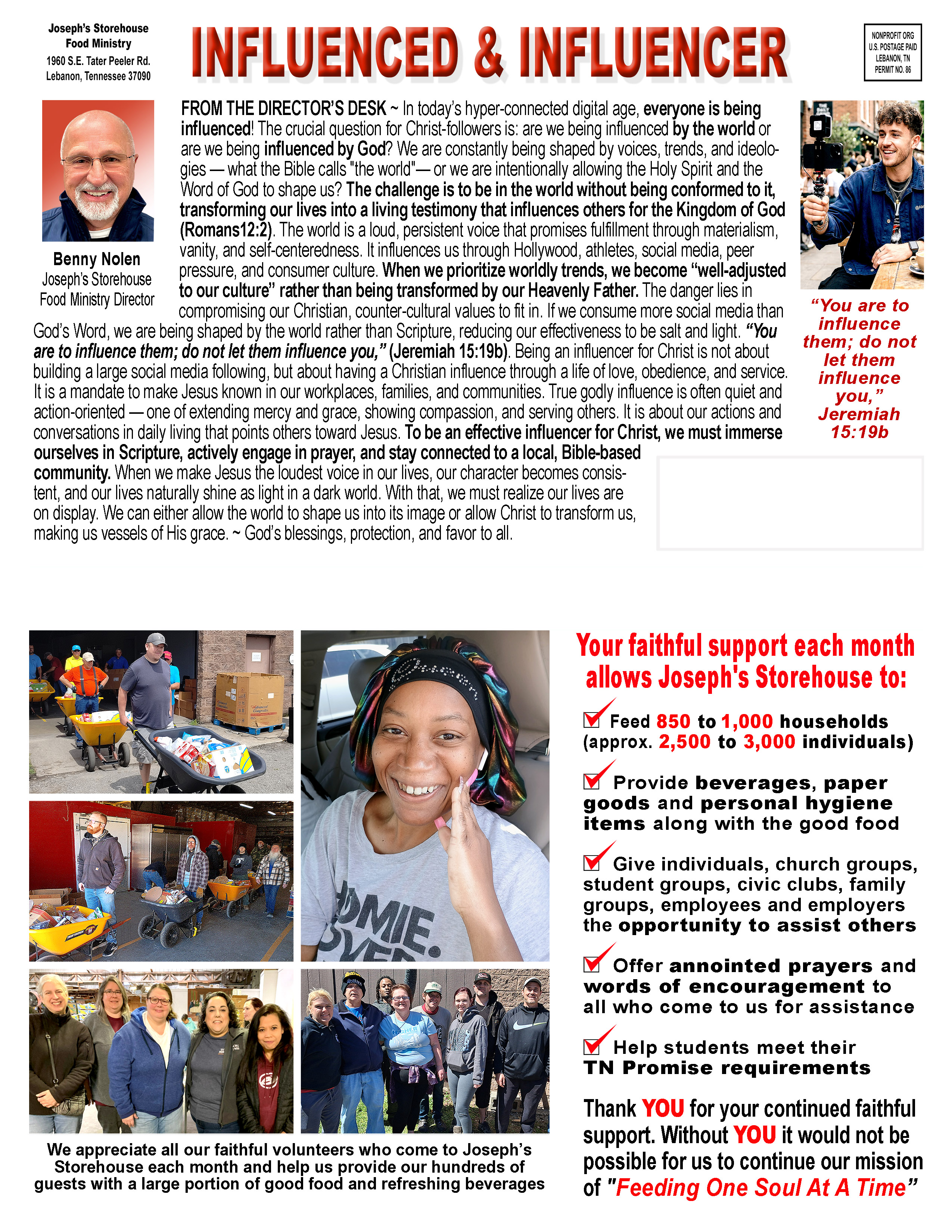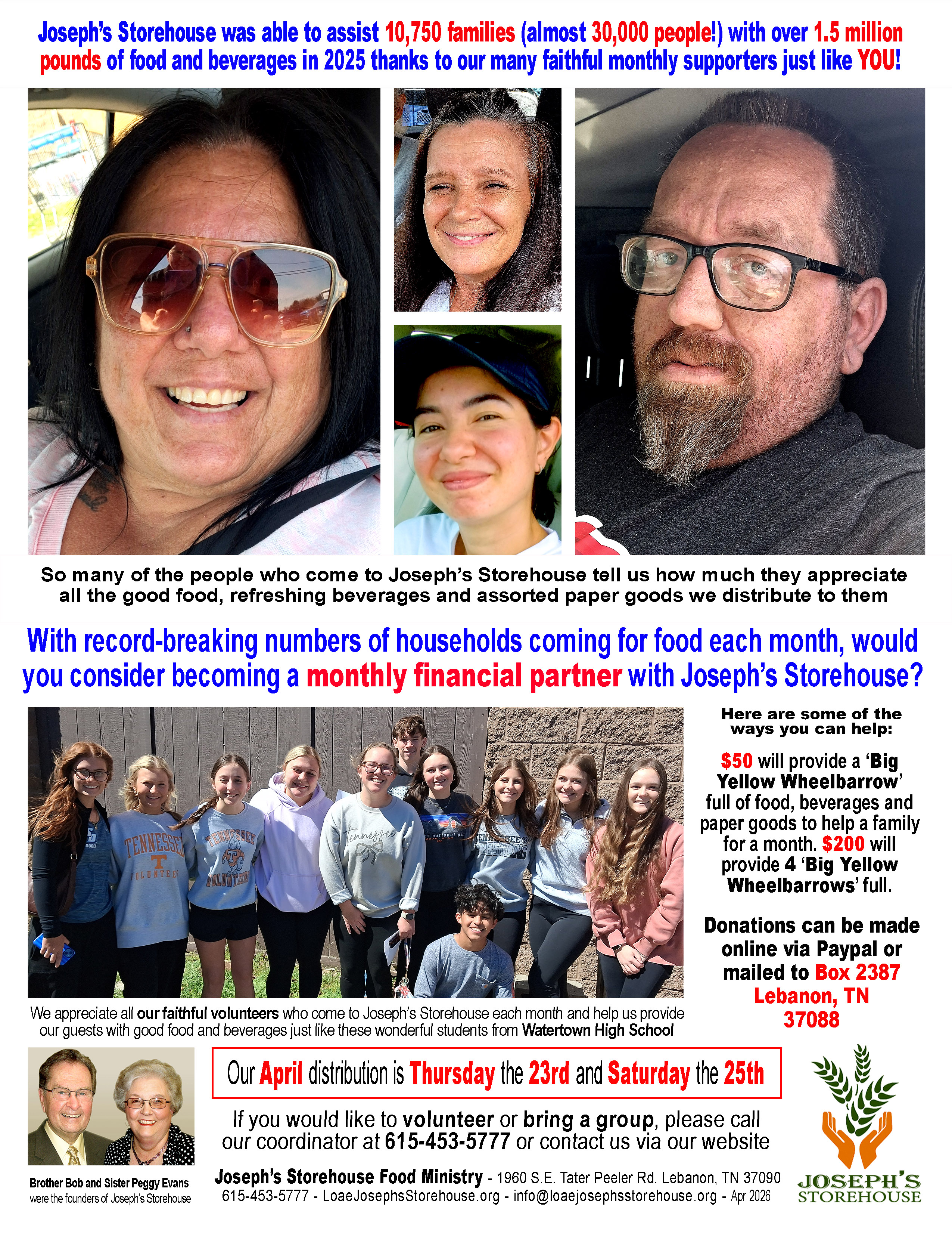 Joseph's Storehouse is a faith-based food ministry that began in 1999 distributing food to only 22 families and has grown to provide assistance to an average of 800 families per month. We also provide assistance to other nonprofit agencies in the Middle Tennessee area. We distribute over $100,000 worth of food, toiletries and household items monthly. The food program targets the low-income, disabled, elderly, and single parents. While we offer one-time emergency food assistance at any time during the month, the primary assistance program is offered the last Saturday of each month and the preceding Thursday.* Please click our calendar link to see actual giveaway dates.